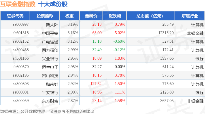 资金流向方面,互联金融(399805)指数成份股当日主力资金净流入合计15.67亿元,游资资金净流出合计18.06亿元,散户资金净流入合计2.06亿元。成份股资金流向详情见下表: