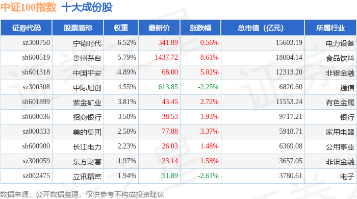 中证100(399903)指数十大成份股详情如下: