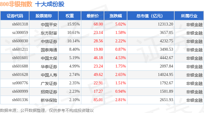 800非银(399966)指数十大成份股详情如下: