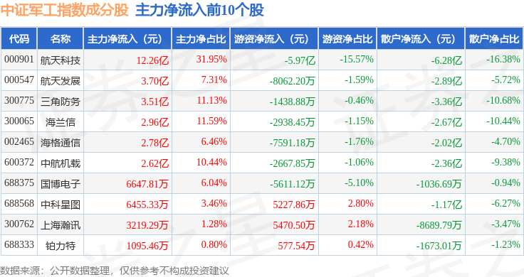 资金流向方面,中证军工(399967)指数成份股当日主力资金净流出合计38.19亿元,游资资金净流入合计12.62亿元,散户资金净流入合计25.57亿元。成份股资金流向详情见下表:
