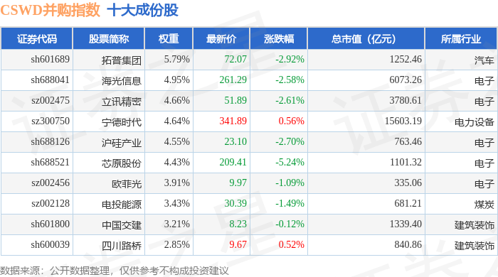 CSWD并购(399992)指数十大成份股详情如下: