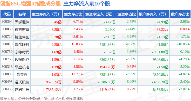 资金流向方面,创指ESG增强R(470034)指数成份股当日主力资金净流出合计34.84亿元,游资资金净流出合计2.65亿元,散户资金净流入合计37.49亿元。成份股资金流向详情见下表: