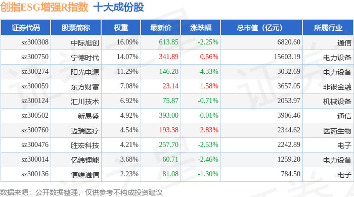创指ESG增强R(470034)指数十大成份股详情如下: