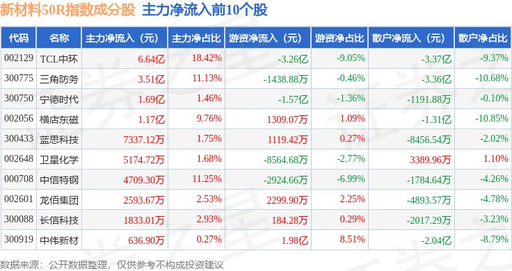 资金流向方面,新材料50R(470042)指数成份股当日主力资金净流出合计40.79亿元,游资资金净流入合计4.53亿元,散户资金净流入合计36.26亿元。成份股资金流向详情见下表: