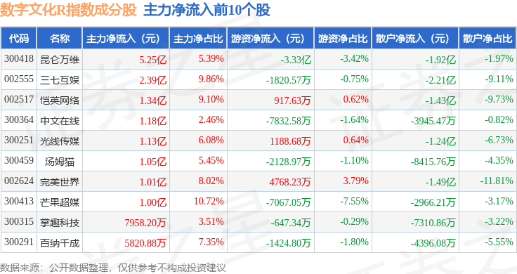 资金流向方面,数字文化R(470047)指数成份股当日主力资金净流入合计4.12亿元,游资资金净流出合计5.85亿元,散户资金净流入合计1.73亿元。成份股资金流向详情见下表: