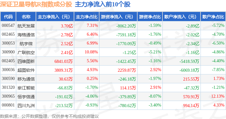 资金流向方面,深证卫星导航R(470050)指数成份股当日主力资金净流出合计11.43亿元,游资资金净流出合计5258.75万元,散户资金净流入合计11.95亿元。成份股资金流向详情见下表: