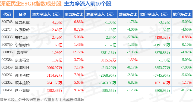 资金流向方面,深证民企ESGR(470056)指数成份股当日主力资金净流出合计68.35亿元,游资资金净流入合计7.71亿元,散户资金净流入合计60.64亿元。成份股资金流向详情见下表: