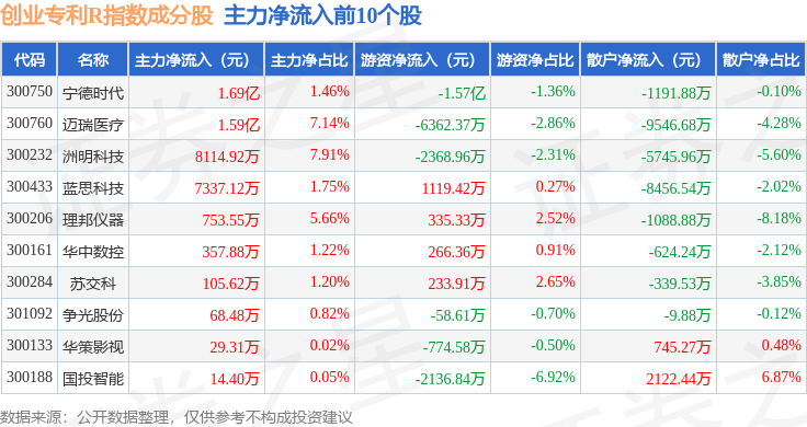 资金流向方面,创业专利R(470068)指数成份股当日主力资金净流出合计59.4亿元,游资资金净流入合计6.16亿元,散户资金净流入合计53.24亿元。成份股资金流向详情见下表:
