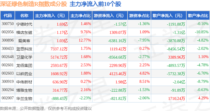 资金流向方面,深证绿色制造R(470069)指数成份股当日主力资金净流出合计104.6亿元,游资资金净流入合计15.65亿元,散户资金净流入合计88.95亿元。成份股资金流向详情见下表: