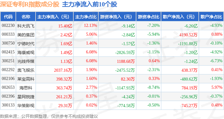 资金流向方面,深证专利R(470067)指数成份股当日主力资金净流出合计55.2亿元,游资资金净流入合计3.47亿元,散户资金净流入合计51.73亿元。成份股资金流向详情见下表: