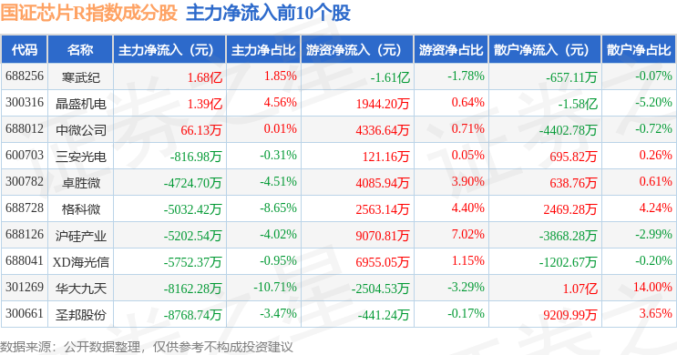 资金流向方面,国证芯片R(480017)指数成份股当日主力资金净流出合计104.02亿元,游资资金净流入合计49.42亿元,散户资金净流入合计54.6亿元。成份股资金流向详情见下表: