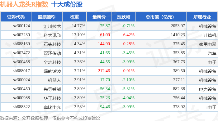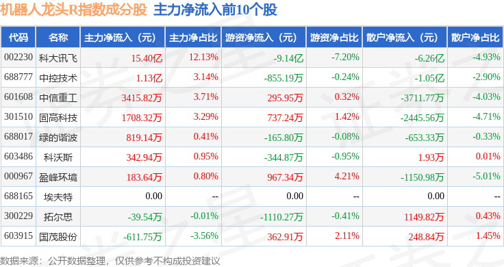 资金流向方面,机器人龙头R(480071)指数成份股当日主力资金净流出合计23.17亿元,游资资金净流出合计2.39亿元,散户资金净流入合计25.55亿元。成份股资金流向详情见下表: