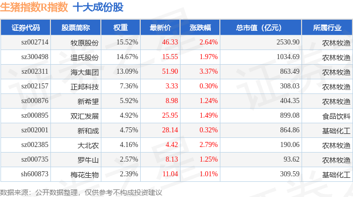资金流向方面,生猪指数R(480073)指数成份股当日主力资金净流入合计1.42亿元,游资资金净流出合计1.39亿元,散户资金净流出合计334.16万元。成份股资金流向详情见下表:
