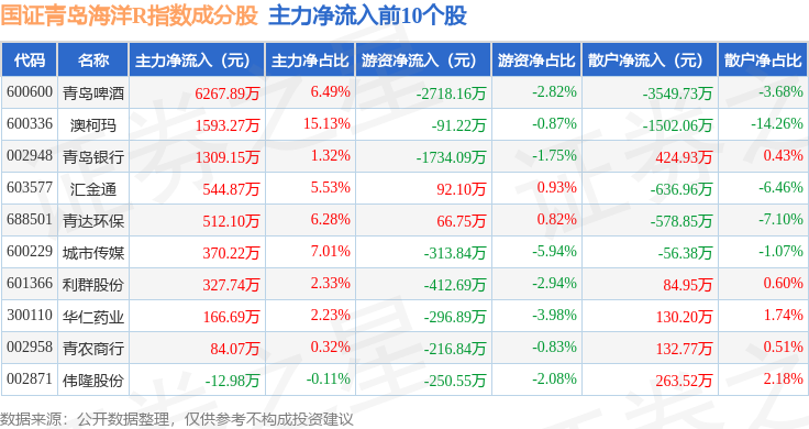 资金流向方面,国证青岛海洋R(480532)指数成份股当日主力资金净流出合计5.65亿元,游资资金净流入合计6056.85万元,散户资金净流入合计4.98亿元。成份股资金流向详情见下表: