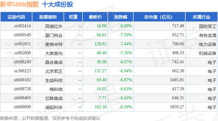 新华500R(489001)指数十大成份股详情如下: