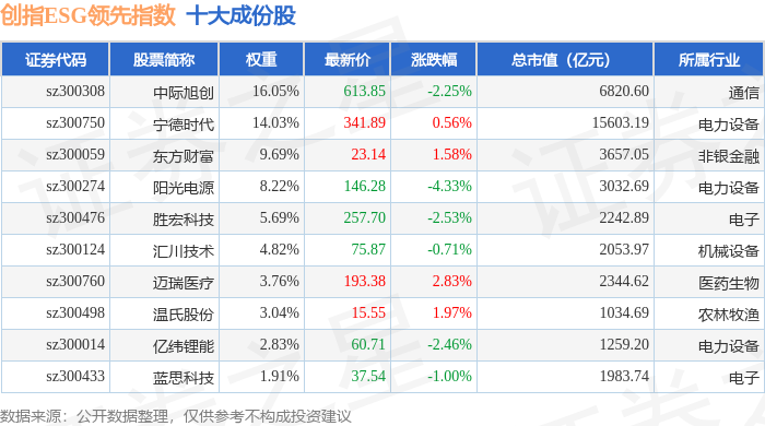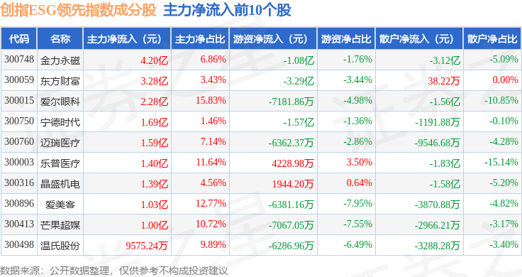 资金流向方面,创指ESG领先(970031)指数成份股当日主力资金净流出合计46.36亿元,游资资金净流入合计7.68亿元,散户资金净流入合计38.68亿元。成份股资金流向详情见下表: