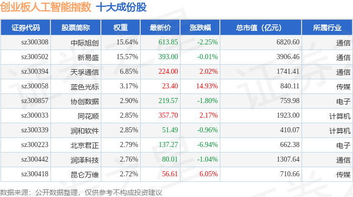 创业板人工智能(970070)指数十大成份股详情如下: