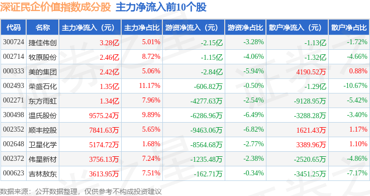 资金流向方面,深证民企价值(970072)指数成份股当日主力资金净流入合计4.19亿元,游资资金净流出合计6.9亿元,散户资金净流入合计2.71亿元。成份股资金流向详情见下表: