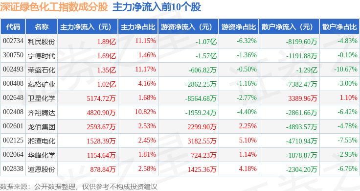 资金流向方面,深证绿色化工(970076)指数成份股当日主力资金净流出合计21.05亿元,游资资金净流入合计1.6亿元,散户资金净流入合计19.45亿元。成份股资金流向详情见下表: