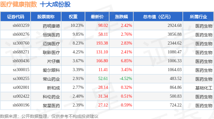 医疗健康(980016)指数十大成份股详情如下: