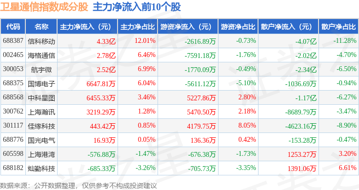 资金流向方面,卫星通信(980018)指数成份股当日主力资金净流出合计36.7亿元,游资资金净流入合计8.46亿元,散户资金净流入合计27.91亿元。成份股资金流向详情见下表: