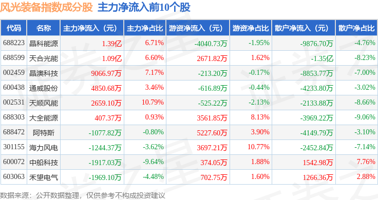 资金流向方面,风光装备(980026)指数成份股当日主力资金净流出合计55.52亿元,游资资金净流入合计12.84亿元,散户资金净流入合计42.68亿元。成份股资金流向详情见下表: