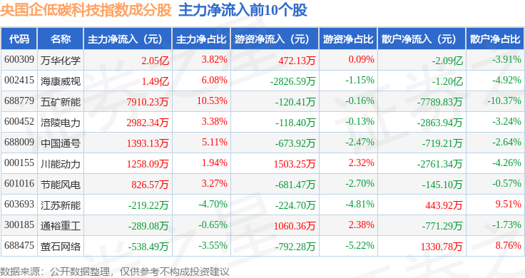 资金流向方面,央国企低碳科技(980082)指数成份股当日主力资金净流出合计52.39亿元,游资资金净流入合计16.62亿元,散户资金净流入合计35.77亿元。成份股资金流向详情见下表: