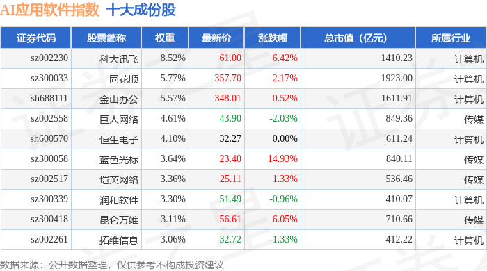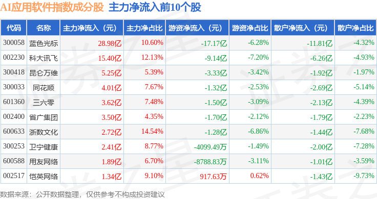 资金流向方面,AI应用软件(980107)指数成份股当日主力资金净流入合计64.97亿元,游资资金净流出合计40.81亿元,散户资金净流出合计24.16亿元。成份股资金流向详情见下表: