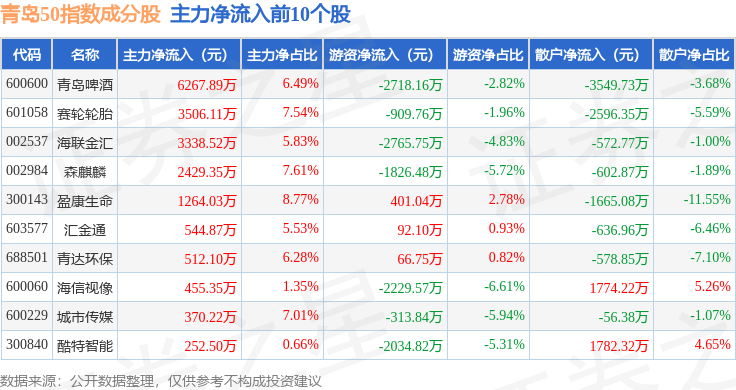 资金流向方面,青岛50(989011)指数成份股当日主力资金净流出合计5.81亿元,游资资金净流入合计7897.49万元,散户资金净流入合计5.02亿元。成份股资金流向详情见下表: