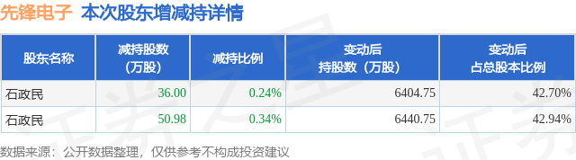 证券之星消息,1月29日先锋电子发布公告《先锋电子:简式权益变动报告书》,其股东石政民于2026年1月28日至2026年1月29日间合计减持86.98万股,占公司目前总股本的0.5799%,变动期间该股股价下跌9.35%,截止1月29日收盘报21.81元。