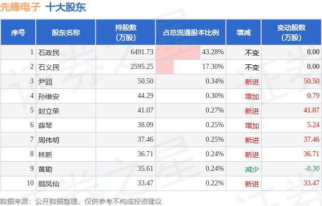 根据先锋电子2025年三季报公布的十大股东详情如下: