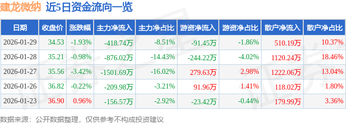 证券之星消息,截至2026年1月29日收盘,建龙微纳(688357)报收于34.53元,下跌1.93%,换手率1.41%,成交量1.41万手,成交额4920.51万元。
