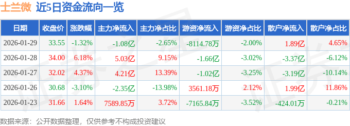 证券之星消息,截至2026年1月29日收盘,士兰微(600460)报收于33.55元,下跌1.32%,换手率7.2%,成交量119.82万手,成交额40.62亿元。