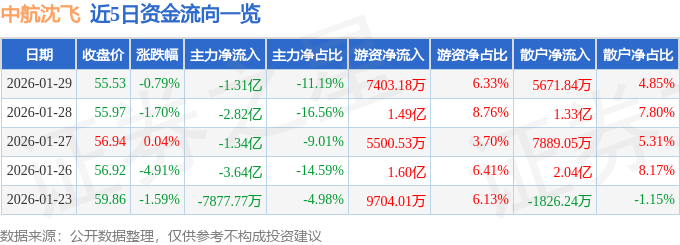 证券之星消息,截至2026年1月29日收盘,中航沈飞(600760)报收于55.53元,下跌0.79%,换手率0.74%,成交量21.02万手,成交额11.69亿元。