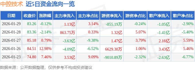 证券之星消息,截至2026年1月29日收盘,中控技术(688777)报收于83.26元,下跌0.12%,换手率5.4%,成交量42.31万手,成交额36.05亿元。
