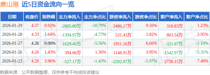 证券之星消息,截至2026年1月29日收盘,唐山港(601000)报收于4.37元,上涨0.92%,换手率1.01%,成交量59.6万手,成交额2.6亿元。