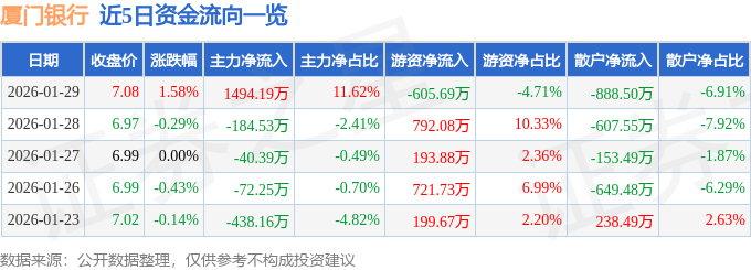 证券之星消息,截至2026年1月29日收盘,厦门银行(601187)报收于7.08元,上涨1.58%,换手率0.7%,成交量18.34万手,成交额1.29亿元。