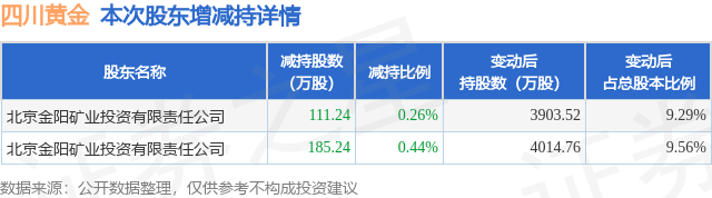 证券之星消息,1月29日四川黄金发布公告《四川黄金:关于持股5%以上股东减持期间届满暨减持股份实施情况的公告》,其股东北京金阳矿业投资有限责任公司于2025年11月22日至2026年1月28日间合计减持296.48万股,占公司目前总股本的0.7059%,变动期间该股股价上涨152.49%,截止1月28日收盘报66.86元。