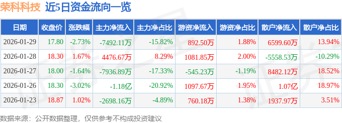 证券之星消息,截至2026年1月29日收盘,荣科科技(300290)报收于17.8元,下跌2.73%,换手率4.13%,成交量26.44万手,成交额4.74亿元。