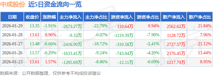 证券之星消息,截至2026年1月29日收盘,中成股份(000151)报收于13.35元,下跌1.91%,换手率2.83%,成交量8.71万手,成交额1.17亿元。