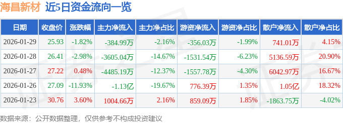 证券之星消息,截至2026年1月29日收盘,海昌新材(300885)报收于25.93元,下跌1.82%,换手率4.08%,成交量6.81万手,成交额1.79亿元。