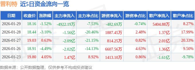 证券之星消息,截至2026年1月29日收盘,普利特(002324)报收于18.16元,下跌1.52%,换手率4.57%,成交量35.49万手,成交额6.53亿元。