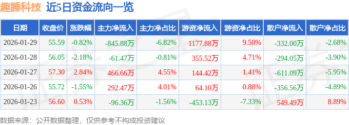 证券之星消息,截至2026年1月29日收盘,趣睡科技(301336)报收于55.59元,下跌0.82%,换手率7.15%,成交量2.18万手,成交额1.24亿元。