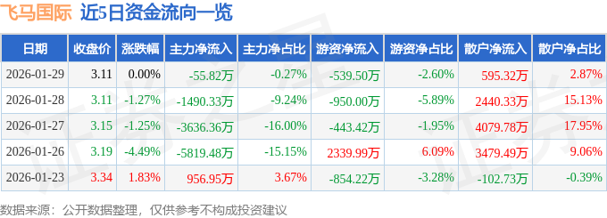 证券之星消息,截至2026年1月29日收盘,飞马国际(002210)报收于3.11元,上涨0.0%,换手率2.5%,成交量66.39万手,成交额2.08亿元。