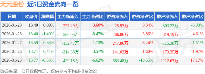 证券之星消息,截至2026年1月29日收盘,天元股份(003003)报收于13.4元,上涨0.0%,换手率4.87%,成交量5.73万手,成交额7709.94万元。