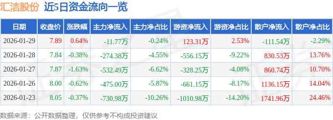 证券之星消息,截至2026年1月29日收盘,汇洁股份(002763)报收于7.89元,上涨0.64%,换手率2.03%,成交量6.16万手,成交额4865.33万元。