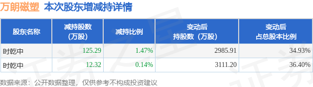 证券之星消息,1月29日万朗磁塑发布公告《万朗磁塑:万朗磁塑关于控股股东权益变动触及1%刻度的提示性公告》,其股东时乾中于2026年1月22日至2026年1月29日间合计减持137.61万股,占公司目前总股本的1.6098%,变动期间该股股价上涨1.92%,截止1月29日收盘报45.2元。
