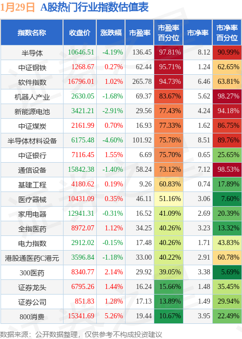 热门行业指数方面,半导体的市盈率百分位较高,为97.81%。而800消费的市盈率百分位较低,为10.67%。