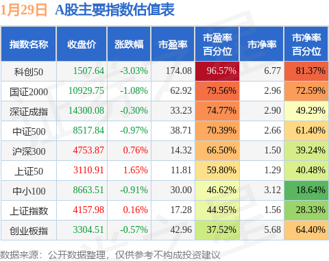 证券之星消息,1月29日A股收盘,上证综指指涨0.16%,报收4157.98点;深圳成指跌0.3%,报收14300.08点;创业板指跌0.57%,报收3304.51点。