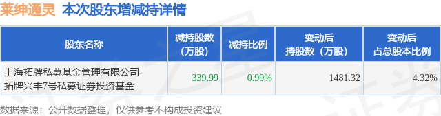 证券之星消息,1月29日莱绅通灵发布公告《莱绅通灵:莱绅通灵持股5%以上股东减持股份结果公告》,其股东上海拓牌私募基金管理有限公司-拓牌兴丰7号私募证券投资基金于2026年1月28日合计减持339.99万股,占公司目前总股本的0.9912%,变动期间该股股价上涨10.03%,截止1月28日收盘报10.53元。